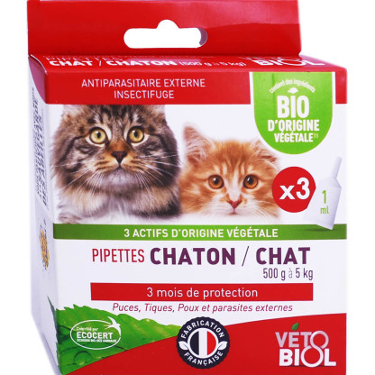 A partir d’ingrédients actifs d’origine végétale et issus de l’agriculture biologique, Biovetol élabore et fabrique une gamme complète de solutions labellisées par ECOCERT destinées à l’hygiène et au bien-être animal (antiparasitaires, shampooings, soins de la zone ORL, etc.). Vétobiol Pipettes Chaton Chat 500 g à 5 kg 3 Pipettes protègent le chaton (à partir de 8 semaines) et le chat des parasites externes, par l'action insectifuge des actifs biocides d'origine végétale présents. Le produit se répartit sur toute la surface du corps par diffusion dans le sébum et construit un film protecteur contre les puces, tiques, poux, moustiques, phlébotomes, aoûtats. Cette protection n'est efficace que si l'on traite l'environnement en même temps. Ecosoin Bio contrôlé par Ecocert Greenlife selon le référentiel Ecocert. Fabrication française.
