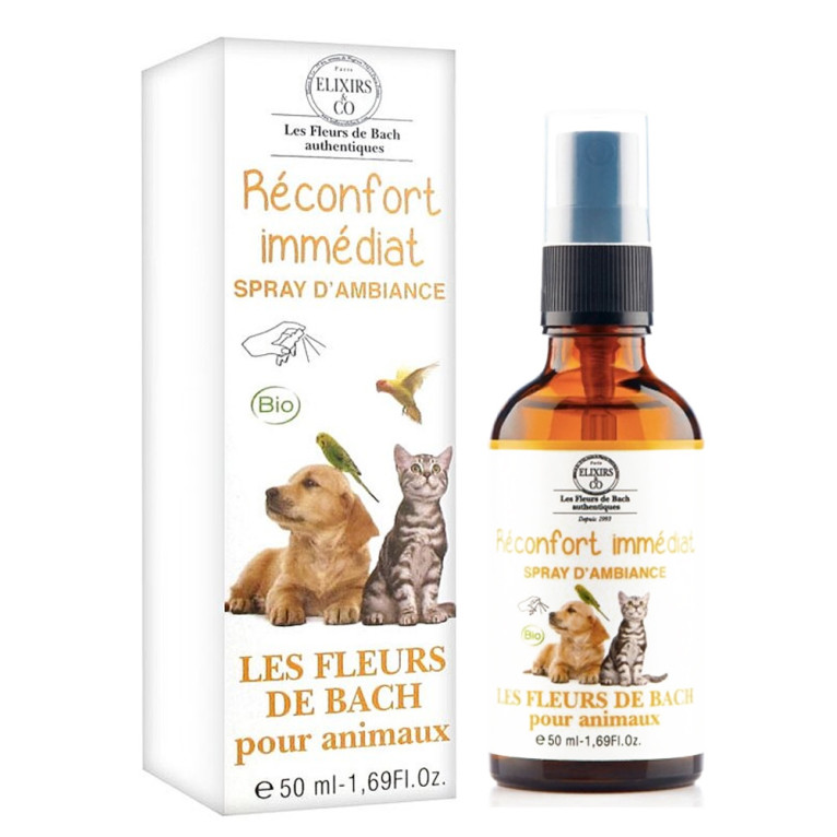 Fleurs de Bach pour animaux Réconfort immédiat ELIXIRS & CO discount, le spray d’ambiance aux extraits de fleurs de bach et huiles essentielles dans votre parapharmacie en ligne à prix discount, qui détend et apaise immédiatement les animaux pouvant être stressés par des changements (déménagement, séparation, arrivée d’un animal ou d’un enfant,…).