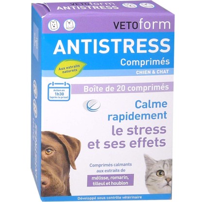 ANTISTRESS Chien et chat de VETOFORM discount, l’aliment complémentaire naturel dans votre parapharmacie en ligne à prix discount, qui détend et apaise les animaux pouvant être stressés par des changements (déménagement, séparation, arrivée d’un animal ou d’un enfant,…) ou lors de problèmes de comportements (marquage urinaire, comportement destructeur,…)