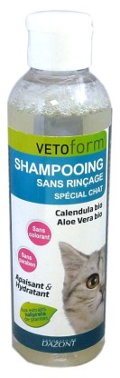 La marque VETOFORM est composée de compléments alimentaires, et antiparasitaires à base d’actifs naturels, destinés aux animaux de compagnie pour leur bien-être au quotidien. Le shampooing sans rinçage très doux en lotion nettoie et hydrate les poils et la peau sans agresser par son pH neutre grâce à l’eau florale de calendula et au gel d’aloe vera. Sans utiliser d'eau, il est très utile lorsque les animaux ne supportent pas le contact avec l'eau ou lorsqu'il est déconseillé de les mettre dans le bain ou sous la douche. Après le shampooing le poil est brillant et délicatement parfumé au calendula.