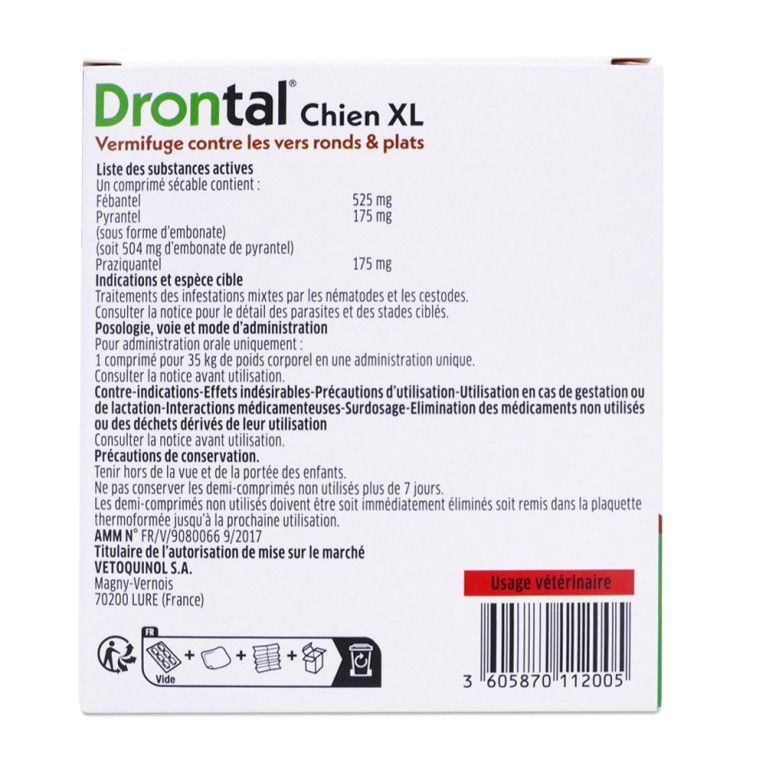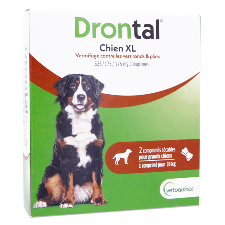 DRONTAL VERMIFUGE CHIEN XL 2 COMPRIMÉS est disponible en vente en ligne à prix discount sur Pharmashopdiscount. Chiens à partir de 17,5 kg.