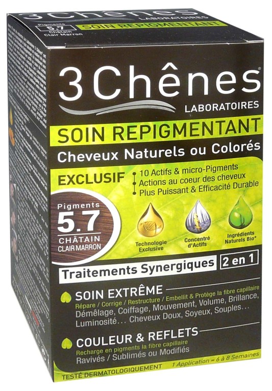 Soin repigmentant des 3 CHENES, une couleur sublime intense et de longue durée pour des cheveux réparés pleins de vitalité et lumineux aux reflets intenses. Pour cheveux naturels, colorés ou méchés. Couleur 5.7 châtain clair marron.