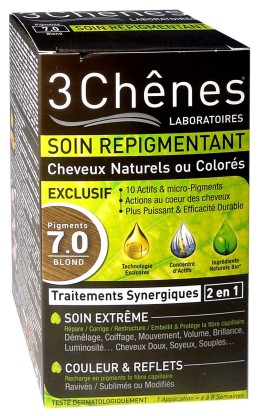Soin repigmentant des 3 CHENES, une couleur sublime intense et de longue durée pour des cheveux réparés pleins de vitalité et lumineux aux reflets intenses. Pour cheveux naturels, colorés ou méchés. Couleur Blond 7.0.