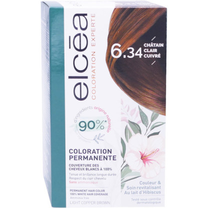 ELCEA Coloration Experte discount des laboratoires ELCEA, la coloration conçue par des experts capillaires dans votre parapharmacie en ligne à prix discount, pour assurer couleur intense, brillance et protection longue durée, Châtain Clair Cuivré N°6.34