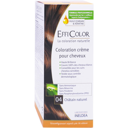 Coloration Capillaire EFFICOLOR Permanente discount d'INELDEA, la coloration haute performance dans votre parapharmacie en ligne à prix discount, pour assurer couleur intense, brillance et protection longue durée, Châtain Naturel 04.