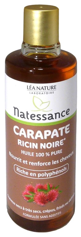 Les Huiles de NATESSANCE sont composées exclusivement d’huiles 100% pures sans produits chimiques pour le respect de la peau et des cheveux. L’huile de Carapate appelée aussi Ricin noire est fabriquée de façon artisanale dont les graines sont bouillies dans l’eau et l’huile qui surnage récoltée. L’huile de Ricin quant à elle est fabriquée par pression à froid par les graines décortiquées. Le procédé de fabrication est différent mais les résultats sont les mêmes. L’huile riche en polyphénols renforce, nourrit et protège la fibre capillaire et les sourcils pour leur redonner tonus et beauté, et fortifie les ongles et les cils par ses extraits d’huile de ricin naturelle, ainsi que la vitamine E naturelle. Les cheveux retrouvent leur brillance, ils poussent plus vite, les ongles sont plus forts.