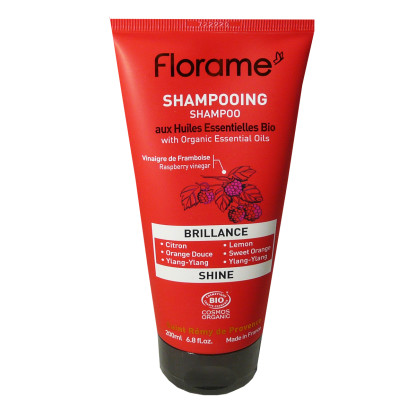 Shampooing Brillance de FLORAME à prix discount, le shampooing aux huiles essentielles naturelles de d’ylang-ylang, orange douce, et extraits de vinaigre de framboise dans votre parapharmacie en ligne discount, pour prendre soin des cheveux ternes, colorés ou abîmés et leur redonner de la brillance.