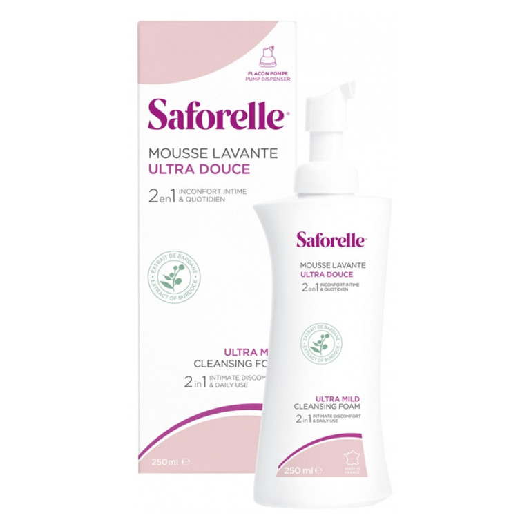 Afin de répondre aux besoins spécifiques de la sphère intime féminine, SAFORELLE a conçu une gamme de soins élaborés à partir d’extraits naturels de bardane, plante herbacée aux propriétés apaisantes et adoucissantes utilisée depuis l’antiquité, pour participer chaque jour à la protection de cette intimité. La mousse lavante ultra-douce SAFORELLE, à la formule haute tolérance sans savon ni parfum, au pH alcalin, enrichie en agent Sepicalm issu de l’avoine aux propriétés apaisantes, est spécialement conçu pour laver en douceur, calmer les irritations et les sensations d’inconfort des muqueuses sensibles. Formule Testée sous contrôle médical par des gynécologues et des dermatologues, sans phenoxyethanol, sans paraben, sans savon, sans colorant.