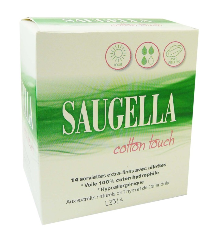 I Les serviettes extra-fines Jour Cotton Touch de SAUGELLA dans votre parapharmacie en ligne discount, s’utilisent au quotidien pendant les règles pour toutes les femmes même à la peau sensible pour une protection optimale toute la journée.
