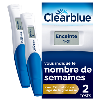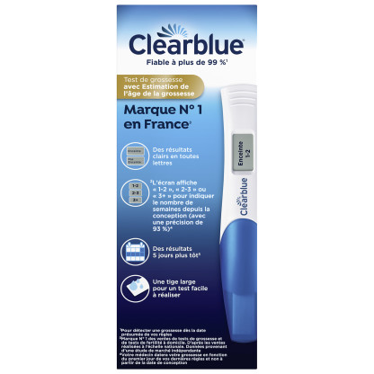 Les produits CLEARBLUE sont spécialisés dans les tests de grossesses, d’ovulation et de fertilité, et des moniteurs de contraception. Clairs et simples d’utilisation, leurs résultats sont efficaces. Ce test de grossesse digital urinaire CLEARBLUE permet de détecter une grossesse à partir de 4 jours avant la date présumée des règles. Il permet par sa concentration en hormone HCG (chorioniques gonadotropes) qui est une hormone présente dans l’urine, d’être sûre d’être enceinte. Lorsque le taux de HCG a une forte augmentation, la grossesse est détectée. Son écran digital permet une lecture très claire et facile du résultat en seulement 3 minutes grâce à son résultat numérique « enceinte », « pas enceinte » avec l’âge de grossesse depuis la conception (1 à 2 semaines, 2 à 3 semaines, plus de 3 semaines)