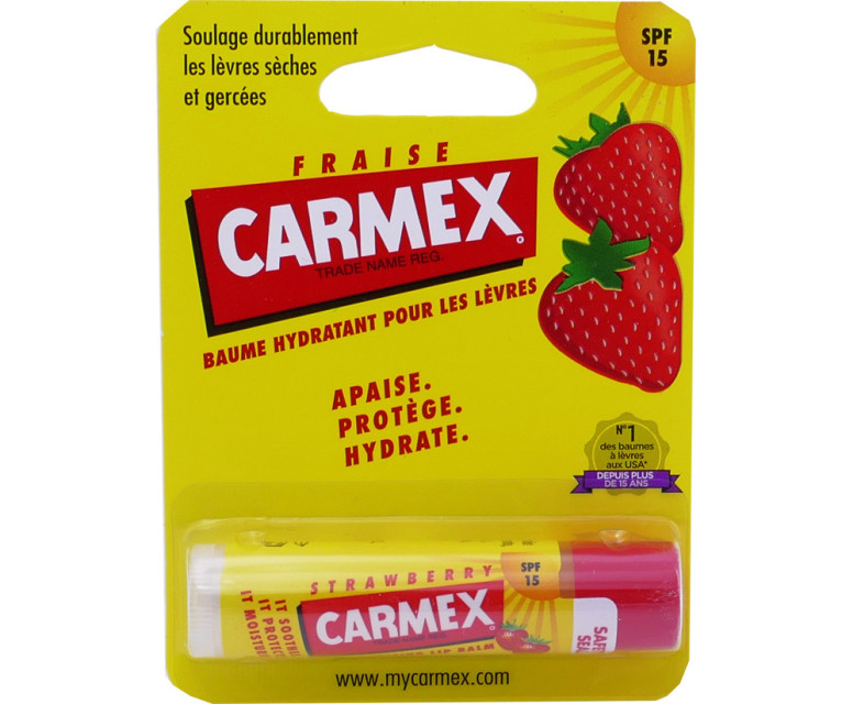 Le laboratoire CARMEX conçoit un baume réparateur et hydratant pour les lèvres abîmées ou desséchées originaire des Etats-Unis. Le Baume hydratant SPF15 pour les lèvres à base de cire d’abeille, beurre de cacao, camphre et menthol, répare, protège des agressions quotidiennes et des rayons UVA/UVB, nourrit, hydrate intensément, et apaise de la sècheresse et des tiraillements dès l’application et pour longtemps. Sa texture baume laissera les lèvres apaisées, douces et souples, et fraîches avec un parfum gourmand de fraise ! Pratique son format stick permet de l’emporter partout avec soi !