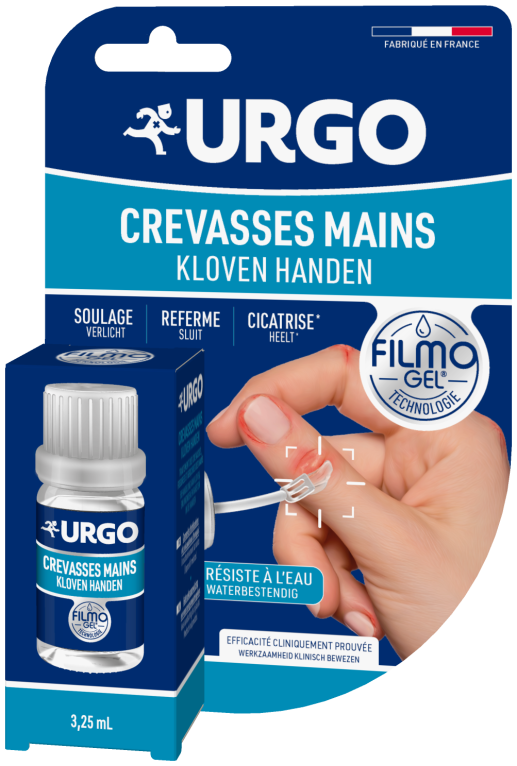 Le laboratoire URGO conçoit des produits pour le soin des mains, des pieds, des plaies cutanées et buccales, des vitamines...Filmogel est un dispositif innovant, un traitement liquide qui se transforme au contact de l’air en film fin et souple transparent, résistant à l’eau pour protéger et isoler les crevasses au niveau des mains. Il offre une action efficace en comblant et évitant la réouverture de la crevasse, et contribue à sa cicatrisation en protégeant des agressions extérieures. Facile à utiliser, il s’applique de façon précise sur la crevasse.