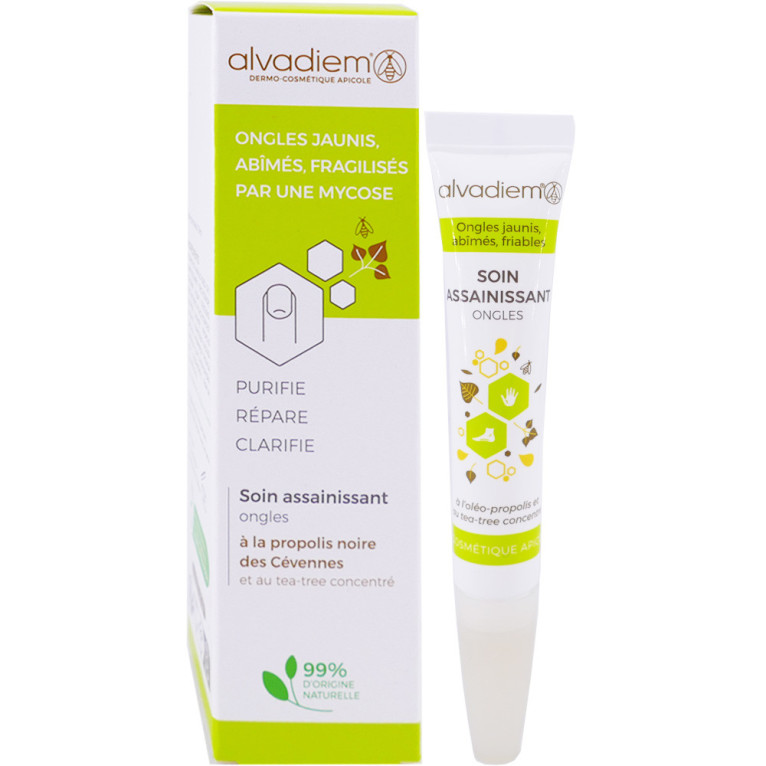Le Soin Assainissant Ongles discount des laboratoires ALVADIEM, le soin naturel pour réparer et clarifier les ongles jaunis, abîmés et fragilisés par une mycose, dans votre parapharmacie en ligne à prix discount. Mains et pieds