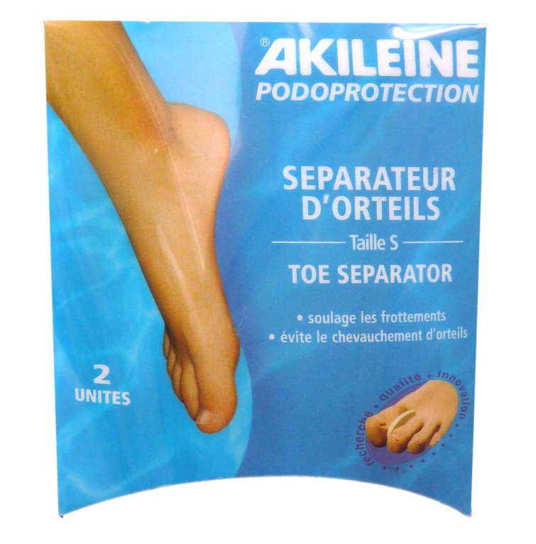 La gamme AKILEINE PODOPROTECTION du laboratoire ASEPTA est composée de protecteurs pour les pieds souffrants de frottements ou de chocs avec hallux-valgus, cors, durillons… Le Séparateur Orteils permet de soulager des douleurs des orteils en protégeant des frottements et en corrigeant leur position pour une marche facilitée. En écartant lees orteils, le séparateur évite l’apparition de cors et les pressions. Pratique le correcteur est lavable en machine à 40°C pour être réutilisé.