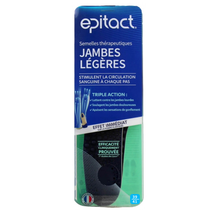 EPITACT SEMELLES THERAPEUTIQUES JAMBES LEGERES en vente en ligne, sur le site de votre parapharmacie à prix discount, sont des semelles spécialement conçues pour soulager les jambes lourdes et fatiguées.