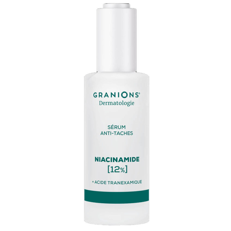 GRANIONS DERMATOLOGIE SERUM ANTI-TACHES NIACINAMIDE 30ML est en vente en ligne sur le site de votre parapharmacie à prix discount, offrant une solution pour les peaux sujettes aux taches pigmentaires.