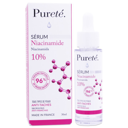 PHARMASCIENCE PURETE SERUM NIACINAMIDE ANTI-TACHES 30ML est en vente en ligne sur le site de votre parapharmacie à prix discount, un sérum conçu pour cibler les taches pigmentaires et convenir à tous types de peaux.