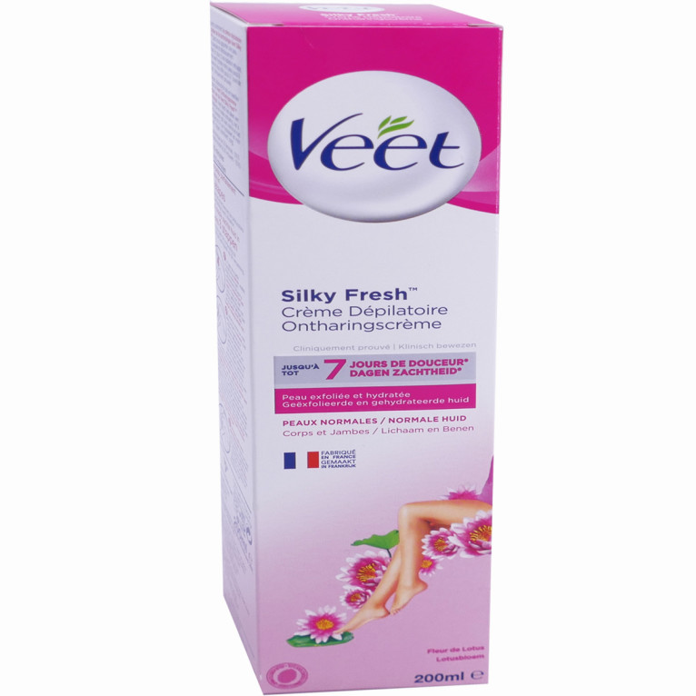 VEET à créé la Crème dépilatoire Jambes et Corps pour peaux normales contenant la Technologie SILKY FRESH, qui va apporter de la douceur à votre peau grâce à La fleur de Lotus et l’hydrater pendant 24 Heures. Votre peau sera soyeuse, exfoliée et délicatement parfumée. Son efficacité cliniquement prouvée dure jusqu’à 7 jours. Testé sous contrôle dermatologique.