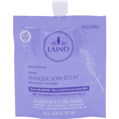 Depuis 1953, la marque LAINO fidèle à ses engagements d’authenticité et naturalité, développe des produits cosmétiques sûrs, efficaces, composés d’ingrédients naturels, simples et traditionnels : argile, pierre d’alun, huile d’olive, savon de Marseille, huile d’amande douce… La gamme Gommages/Masques de LAINO propose des soins spécialement conçus pour offrir toutes les vertus raffermissantes, apaisantes, purifiantes de l’argile. Le masque Soin Eclat de LAINO, à la formule ultra-douce sans paraben, sans phénoxyéthanol, sans silicone et sans huile minérale, est composé d’argile blanche reminéralisante, d’huile de macadamia et d’huile essentielle de lavande bio tonifiante pour rétablir l’éclat, l’énergie et la douceur des peaux ternes et fatiguées. Masque en sachet unidose.