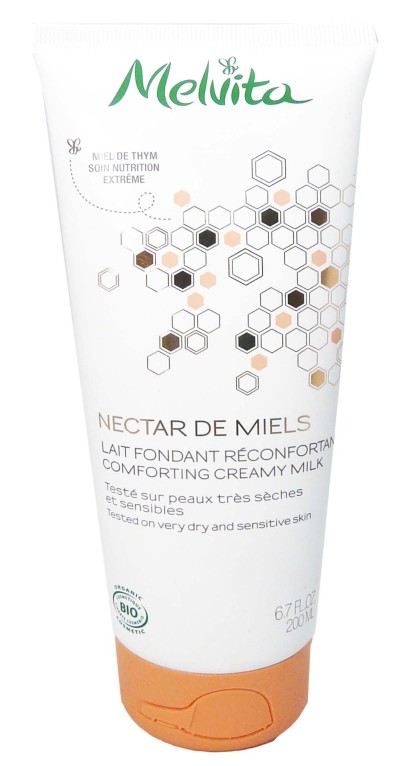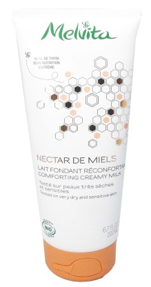 Le Lait fondant réconfortant Nectar de miels de MELVITA, le lait qui prend soin de la peau très sèche et sensible du corps pour réparer et réconforter.