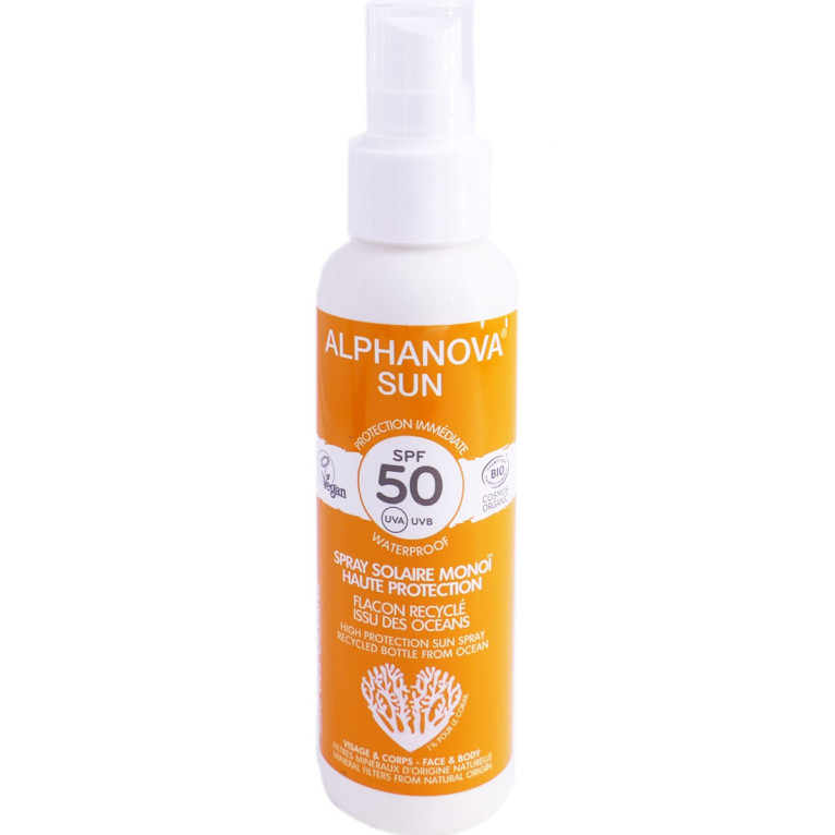 ALPHANOVA Sun BIO SPF50 Spray Solaire certifié biologique, protège la peau des rayons du soleil UVA/UVB grâce aux filtres minéraux d’origine naturelle non toxiques écoresponsables protège la peau des rayons du soleil à forte exposition UVA/UVB grâce aux filtres 100% minéraux non nano, et à sa richesse en huile de jojoba et de Tamanu associé à l’aloe vera. Pour le respect de la planète le flacon spray est fabriqué en plastique recyclé et recyclable sans impact pour l’environnement marin et les coraux. Sans conservateurs chimiques, sans paraben, et sans filtres chimiques elle respecte la peau. Résistante à l’eau, la crème laissera sur la peau un parfum frais et sensoriel de senteur fleuri de Monoï. Testé sous contrôle dermatologique, sans paraben, sans conservateur chimique ni oxyde de zinc.