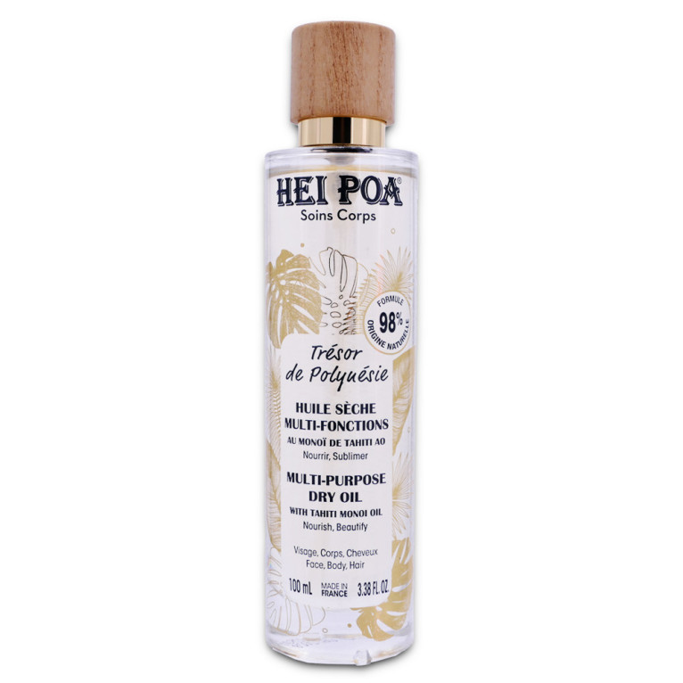 L'huile sèche multifonctions HEI POA est un véritable trésor pour votre peau, composé de Monoï de Tahiti AO. Sa texture légère pénètre rapidement sans laisser de film gras, offrant une hydratation intense tout en laissant un parfum délicat et envoûtant, avec une peau et des cheveux satinés. Idéale pour le corps, les cheveux et le visage, cette huile nourrit en profondeur et apporte éclat et douceur. Que ce soit pour sublimer votre bronzage, nourrir vos cheveux secs ou hydrater votre peau, l'huile sèche multifonctions HEI POA est le soin parfait à intégrer dans votre routine beauté.