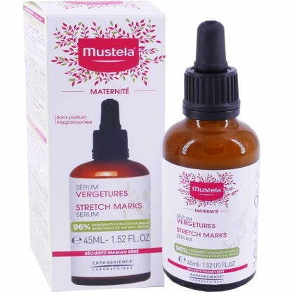 Dans les années 50, un produit totalement innovant révolutionne les soins bébé : un produit 2en1 nettoyant et adoucissant à l’odeur évocatrice : le lait emblématique MUSTELA. 60 ans plus tard, MUSTELA propose toujours des produits sûrs, efficaces, aux formules les plus naturelles possibles pour protéger la peau sensible des bébés et celle de leur maman. La gamme de soins MUSTELA MATERNITE est composée de produits spécialement conçus pour accompagner l’évolution de la peau pendant la grossesse, après l’accouchement et préserver sa beauté. Le Sérum Vergetures de MUSTELA MATERNITE, à la texture qui s’applique facilement en légers massages, est spécialement formulée pour favoriser la réduction des vergetures, par sa formule à base d’actifs d’origine naturelle. Composé d’un actif breveté anti-vergeture issu d’huile de Maracuja, d’acide hyaluronique, d’huile pure d’avocat (riche en acides gras essentiels), et de glycérine, ce sérum favorise la régénération cutanée du film hydrolipidique, hydrate, améliore la souplesse et l’élasticité de la peau et renforce sa résistance aux variations. Formule hypoallergénique haute tolérance testé sous contrôle dermatologique et gynécologique, sans parfum. Compatible avec l'allaitement, innocuité évaluée pour le bébé et la maman.