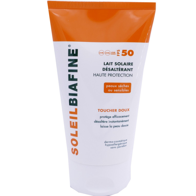La gamme Soleilbiafine du laboratoire BIAFINE propose des produits hautement efficaces pour protéger la peau de toute la famille du soleil par sa formule essentiellement composée d’un actif végétal antioxydant. Le Lait Solaire 50SPF protège très efficacement le visage et le corps des coups de soleil les cellules de la peau du vieillissement prématuré en luttant contre les rayons UVA/UVB, et hydrate intensément et en continu, grâce au système exclusif photostable de filtres anti-UVA/UVB à large spectre, à la vitamine E qui est un puissant anti-oxydant, ainsi qu’aux actifs hydratants (beurre de karité, glycérine). Résistante à l’eau, sa texture est vite absorbée pour une peau douce et confortable. Hypoallergénique, Formule haute tolérance, développée sous contrôle médical et testée cliniquement. Sans paraben