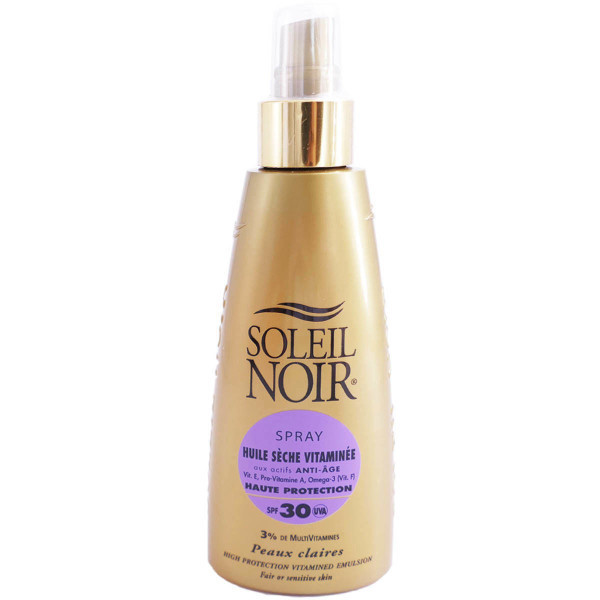 SOLEIL NOIR est une marque spécialisée dans les produits cosmétiques solaires qui développe des crèmes et laits solaires, soins après-solaire à base d’actifs antioxydants et de complexe vitaminé afin de protéger toutes les peaux des méfaits du soleil. L’huile sèche vitaminée (SPF30) est une haute protection qui protège des rayons UVA/UVB tout en agissant comme un soin anti-âge pour préserver la peau et ses cellules du vieillissement prématuré grâce aux 4 filtres solaire et aux antioxydants (pro-rétinol, vitamines A, E et F). Elle va également agir sur la beauté de la peau en la nourrissant et l’hydratant intensément grâce aux huiles nobles (bourrache, onagre, sésame, olive, carotte), aux vitamines B5 et F, et aloe vera. Elle laisse sur la peau une grande douceur dès l’application et dépose un film très fin pour un effet tenseur et une peau raffermit.