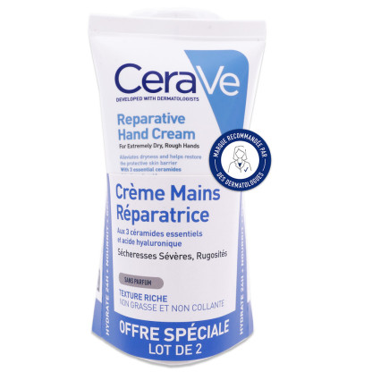 CREME MAINS REPARATRICE 2X50ML du laboratoire CERAVE dans votre parapharmacie en ligne à prix discount, un soin ultra-hydratant et apaisant pour protéger la peau et adoucir les mains très sèches et rugueuses.