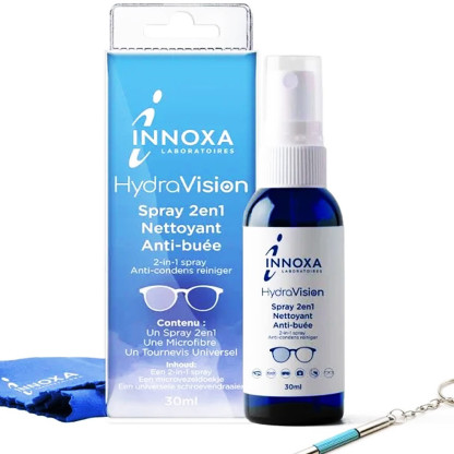 HydraVision Spray 2 en 1 discount d’INNOXA, un produit essentiel en format spray et un tissu en microfibre avec un tournevis universel, pour nettoyer en douceur tous les types de verres des lunettes et empêcher la buée à leur surface, dans votre parapharmacie en ligne à prix discount. Spray de 30ml + tissu microfibre + tournevis universel