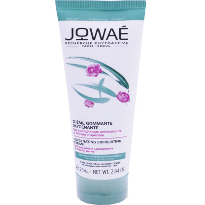 La marque JOWAE inspirée des rituels des femmes coréennes se compose de produits cosmétiques phytoactifs issus de la recherche franco-coréenne à base de lumiphénols et ingrédients naturels pour prendre soin de la peau de toutes les femmes et révéler beauté et confort. La gamme Démaquillage permet grâce aux pouvoirs de la Pivoine Impériale de protéger et apaiser la peau et redonner au visage douceur et confort. La Crème gommante Oxygénante est un soin douceur et frais à base de Lumiphénols (riche en antioxydant) et de Pivoine Impériale (riche en paeoniflorine), associé à du maïs (non-OGM) et des grains exfoliants d’origine végétale. Il va éliminer toutes les impuretés, le maquillage, les cellules mortes et particules de pollution du visage tout en douceur en respectant l’épiderme, apaiser de tout inconfort et tiraillements, protéger la peau des agressions extérieures (pollution, changement de température,…) en formant un film protecteur et laisser une grande douceur, et redonner de l’éclat pour une peau lumineuse. Après le soin, la peau retrouve douceur, et confort, elle est parfaitement nettoyée. Le teint retrouve fraîcheur et éclat. Testé cliniquement sous contrôle dermatologique. Sans microbille plastique, sans paraben, sans phénoxyéthanol, sans huile minérale, sans ingrédient d'origine animale, sans silicone, sans colorant de synthèse