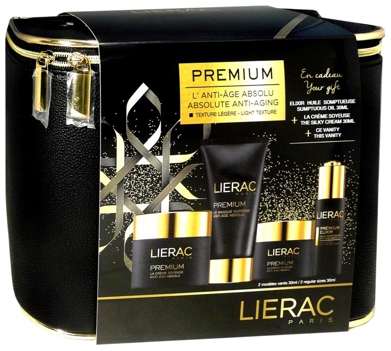 Le coffret PREMIUM de LIERAC, 3 produits anti-âge absolu pour redonner au visage marqué par l’âge de la fermeté et de l’éclat : Crème soyeuse anti-âge absolu (50ml) et (30ml offert) ; Elixir Huile somptueuse anti-âge absolu offert (75ml) et Masque suprême anti-âge absolu (30ml) dans un joli vanity noir très féminin. Pour peaux mature