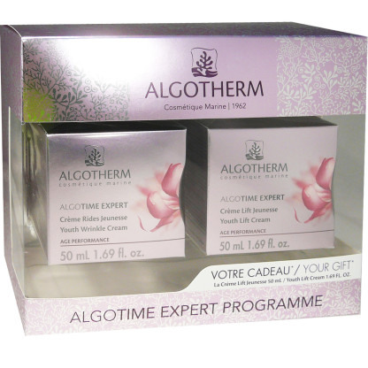 Alogtime Expert d’ALGOTHERM discount, un coffret qui réunit 2 soins anti-âge et anti-taches dans votre parapharmacie en ligne à prix discount, pour redonner à tous les types de peaux du visage beauté, éclat et jeunesse avec un véritable effet lifting : Crème rides jeunesse (50ml), Crème lift jeunesse (50ml) offerte.