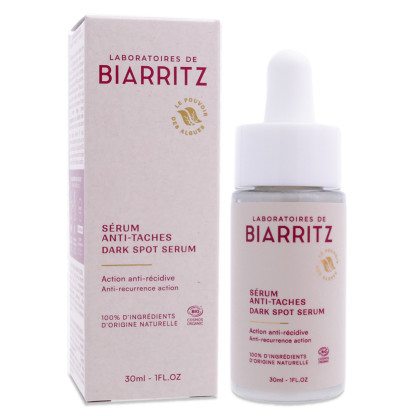 BIARRITZ SERUM ANTI-TACHES 30ML est en vente en ligne sur le site de votre parapharmacie à prix discount, conçu pour atténuer visiblement l'apparence des taches pigmentaires et convenant à un usage quotidien sur tous types de peau.