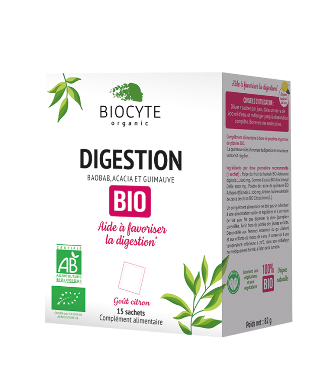 DIGESTION BIO est un complément alimentaire sous forme de poudre au goût citron conditionné en sachet, composé d’extraits de plantes 100% Bio : extrait de guimauve, baobab, acacia. L'extrait de guimauve Bio aide à soutenir la digestion et favorise un meilleur transit intestinal. La formule est complétée par du baobab qui est arbre originaire d’Afrique, de Madagascar et d’Australie très apprécié par sa pulpe de fruit, ainsi que de gomme d’acacia. DIGESTION BIO de BIOCYTE contient un haut dosage de fibres solubles et insolubles.