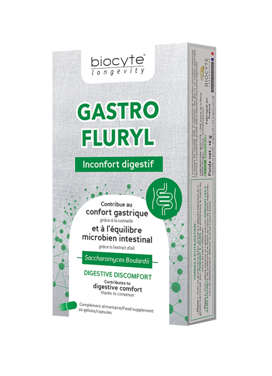 GASTRO FLURYL discount de BIOCYTE, le complément alimentaire à base de poudres et extraits de plantes et de levure, idéal pendant les voyages dans votre parapharmacie en ligne à prix discount.