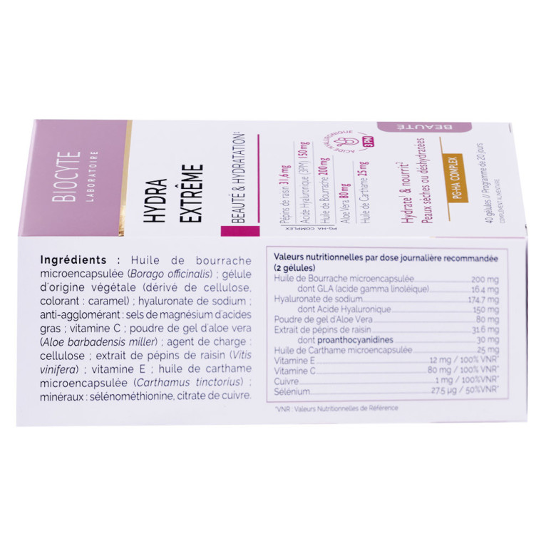BIOCYTE HYDRA EXTREME BEAUTÉ ET HYDRATATION 40 GÉLULES est disponible en vente en ligne sur le site de votre parapharmacie à prix discount