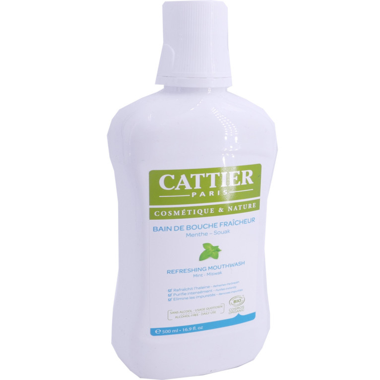 Le laboratoire CATTIER a conçu des produits pour le soin et le bien être de toute la famille à base d’ingrédients naturels bio et d’argiles sans silicone, sans paraben, sans produits chimiques. Le bain de bouche Fraîcheur est spécialement conçu pour rafraichir l’haleine et éliminer les bactéries responsables de la plaque dentaire en respectant les gencives sensibles. Composé d’extraits de plantes bio (réglisse, souak) et d’eau florale de menthe poivre, et utilisé en complément du brossage quotidien, il élimine les bactéries buccales et impuretés notamment dans les endroits difficilement atteignables par la brosse, renforce les dents, purifie et rafraîchit l’haleine tout en apaisant de la sensibilité. L’haleine est fraîche instantanément et pour longtemps par son goût de menthe, et les dents protégées de la plaque. Sans alcool