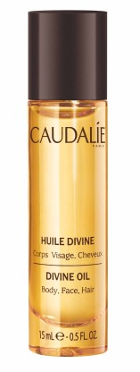 CAUDALIE conçoit des produits à base de polyphénols de raisin naturels pour le plus grand soin de la peau. L’huile Divine est une huile sèche qui nourrit et hydrate intensément la peau grâce à ses huiles de raisin (riche en oméga 6 et en vitamines E), d’hibiscus, de sésame et d’argan, ainsi que de polyphénols qui sont des antioxydants brevetés. Elle peut s’utiliser aussi sur les pointes des cheveux et en touches sur le visage. L’huile laisse la peau délicatement parfumée aux notes florales et boisées.