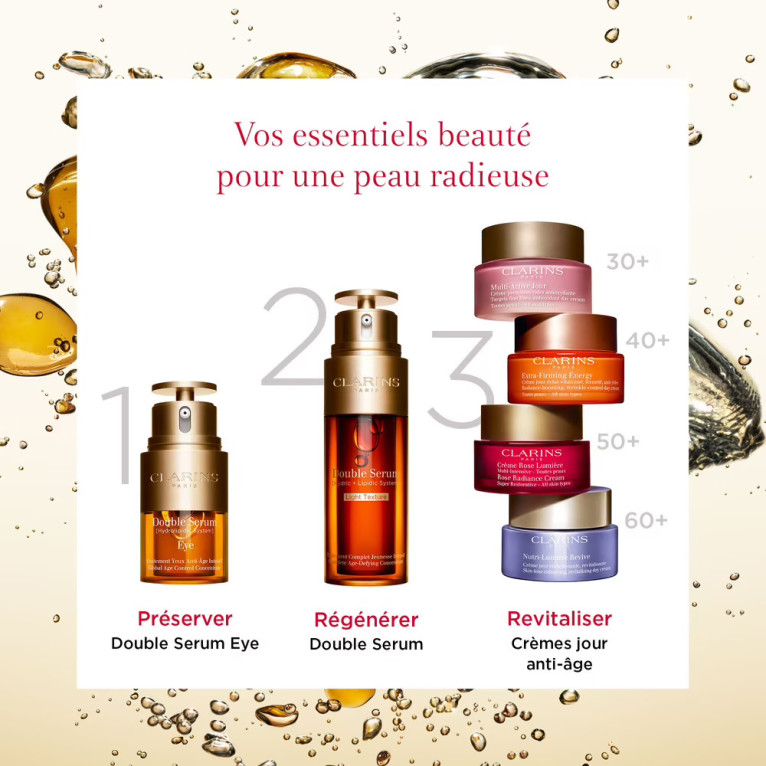 CLARINS DOUBLE SERUM JEUNESSE INTENSIF, Le traitement complet anti-âge intensif à la texture légère adaptée à toutes les peaux, et aussi les hommes, en vente dans votre parapharmacie en ligne.