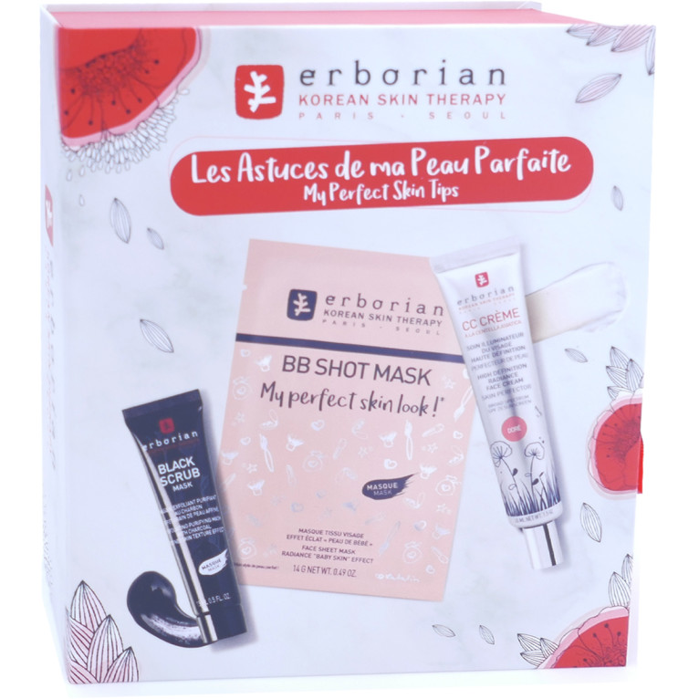Le coffret « Las Astuces de ma Peau Parfaite » d’ERBORIAN dans votre parapharmacie en ligne discount, 3 soins destinés à donner de l’éclat au visage en éliminant tous les défauts ! CC Crème doré (45ml) ; Black Scrub (15ml) ; BB Shot Mask (14g).