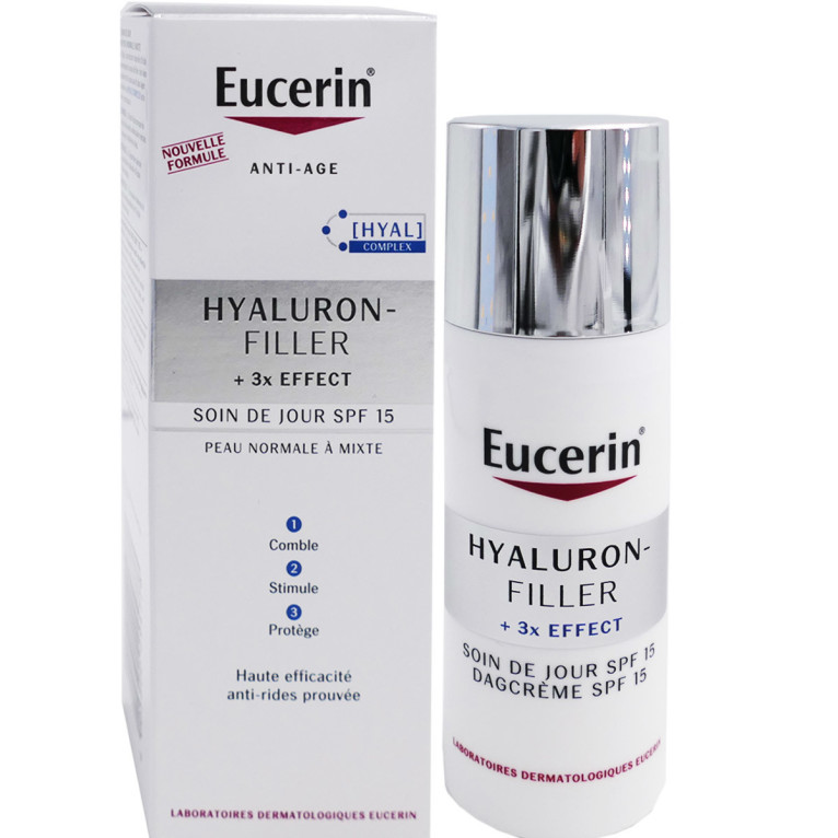 Hyaluron-Filler 3X Effect Soin de jour SPF15 jour d’EUCERIN est un soin à la texture fluide et légère, enrichi d’un filtre de protection solaire (SPF15) spécialement conçu pour combler les rides. Sa composition associe des agents naturels : de l’acide hyaluronique qui offre une action hydratante et qui va contribuer à combler les rides, de la saponine un glucoside bioactif qui stimule la synthèse d’acide hyaluronique, de l'Enoxolone qui va diminuer le taux de dégradation de l'acide hyaluronique. Jour après jour, les rides sont comblées, la peau plus lisse et éclatante parait plus jeune