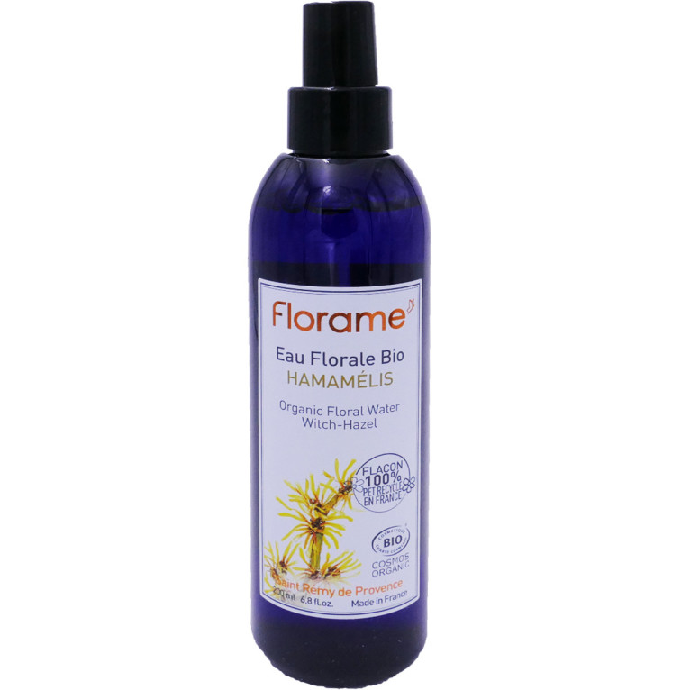 La gamme des Eaux Florales de FLORAME est constituée d’eaux florales bio, obtenues par distillation à la vapeur d’eau de plantes aromatiques issues de l’agriculture biologique, pour offrir à la peau un soin très concentré en actifs naturels. Ces eaux florales offrent à l’épiderme un rafraîchissant bain d’hydratation et sont utilisées comme tonique au réveil, en complément du démaquillant le soir ou en eau de soin tout au long de la journée. L’eau florale Bio d’Hamamélis Bio à base de feuilles d'Hamamélis virginiana, aux propriétés tonifiantes et astringentes est idéale pour raviver l’éclat du teint, et estomper les rougeurs.