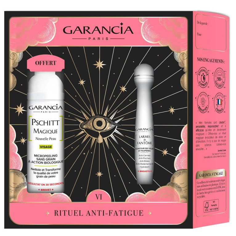 Ce coffret, conçu par la marque Garancia, propose une texture légère et agréable pour une application facile. Il se compose notamment du Contour des Yeux Larmes de Fantôme 10 ml, qui aide à atténuer l'apparence des cernes grâce à ses actifs high-tech et ses extraits botaniques, et du Pschitt Magique Nouvelle Peau 30 ml offert, un micropeeling sans grain qui favorise un nettoyage en douceur pour une peau visiblement plus lisse.