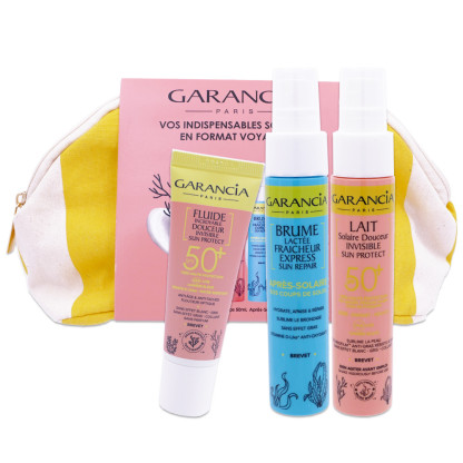 La marque Garancia propose une sélection de soins solaires innovants, adaptés à tous les types de peau. Cette trousse contient trois produits en format voyage, parfaits pour une protection solaire optimale.