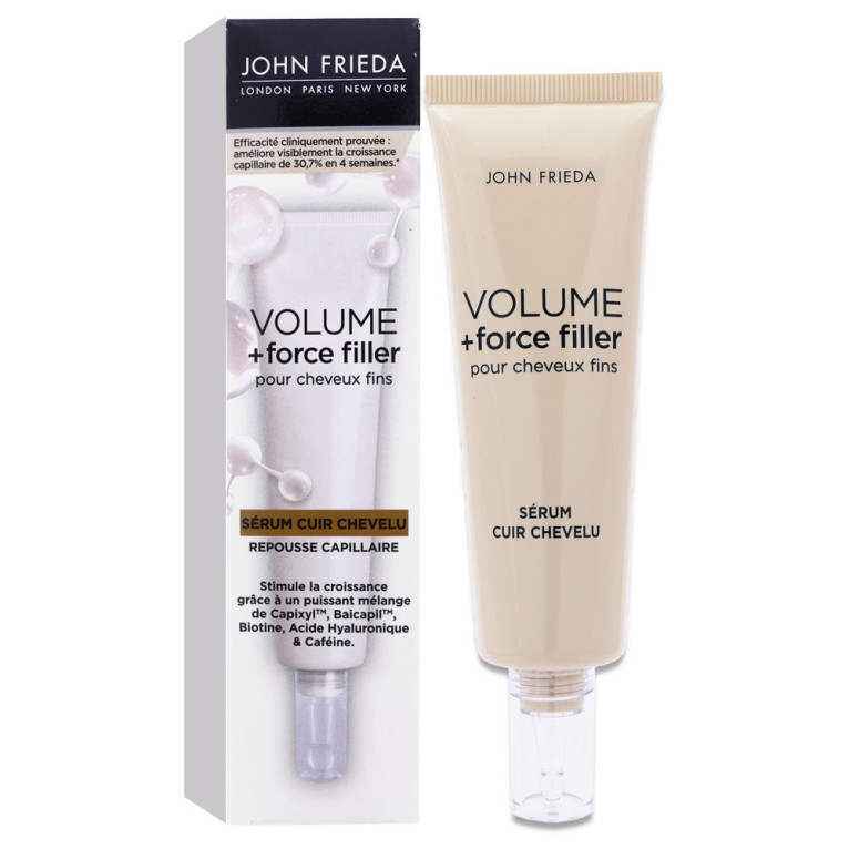JOHN FRIEDA VOLUME + FORCE FILLER SERUM 50ML est en vente en ligne sur le site de votre parapharmacie à prix discount, offrant une solution pour augmenter la densité et le volume des cheveux fins et clairsemés.
