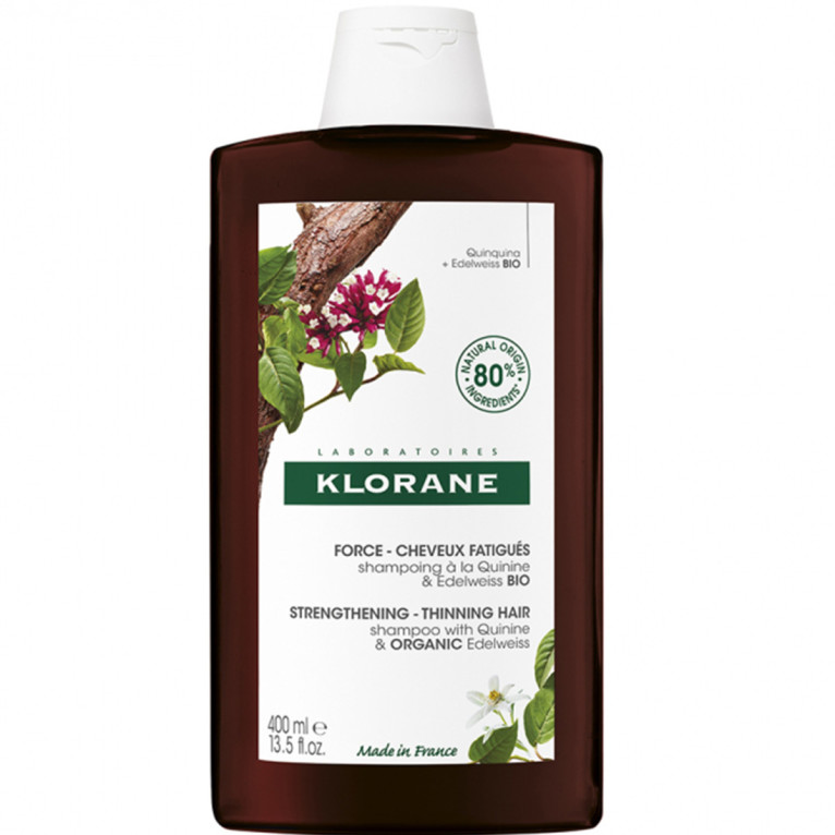 Depuis 1966, les laboratoire KLORANE développent des produits cosmétiques formulés avec des actifs végétaux, authentiques, efficaces, simples et sûrs, issus de la passion du fondateur de la marque, Pierre Fabre, pour la nature et les plantes. La gamme capillaire offre un grand choix de produits conçus pour apporter une solution efficace et naturelle à tous les types de cheveux. La ligne à l’extrait de quinine aux propriétés fortifiantes propose des soins capillaires traitants spécialement conçus pour rétablir santé, force et vigueur à la chevelure, enrayer la chute de cheveux saisonnière et stimuler la repousse. Shampooing à la Quinine de KLORANE, est composé de quinine fortifiante dont l’action est potentialisée par des vitamines B aux propriétés antichute. L’utilisation de ce shampooing réactive la croissance des cheveux et freine leur chute en stimulant le bulbe capillaire. Les cheveux retrouvent force et vigueur jour après jour. Testé sous contrôle dermatologique