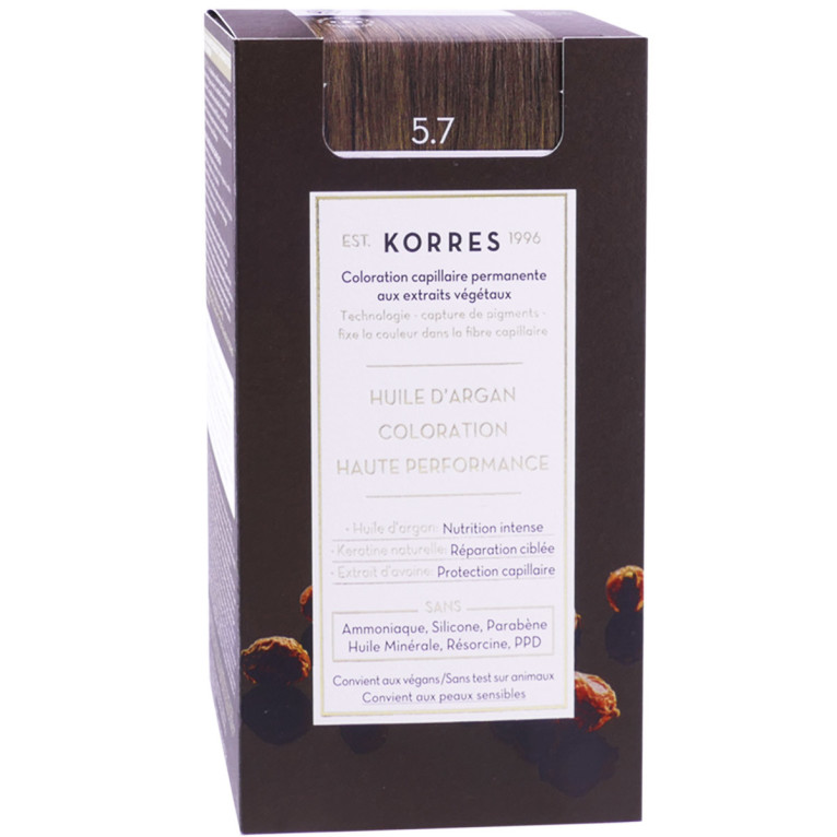 Coloration Capillaire Permanente discount de KORRES, la coloration haute performance dans votre parapharmacie en ligne à prix discount, pour assurer couleur intense, brillance et protection longue durée, Châtain clair marron 5.7