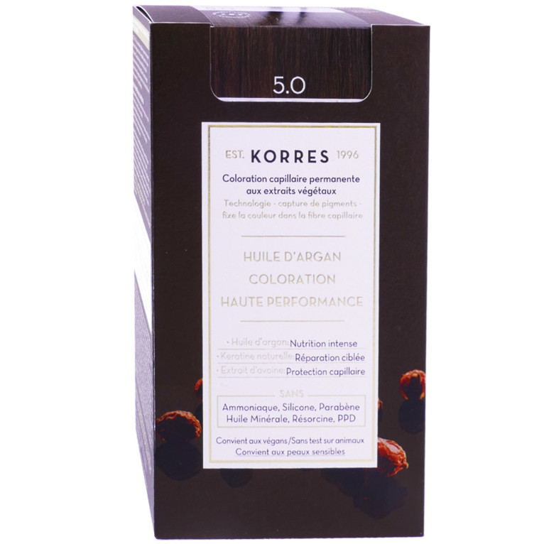 Coloration Capillaire Permanente discount de KORRES, la coloration haute performance dans votre parapharmacie en ligne à prix discount, pour assurer couleur intense, brillance et protection longue durée, Châtain Clair 5.0